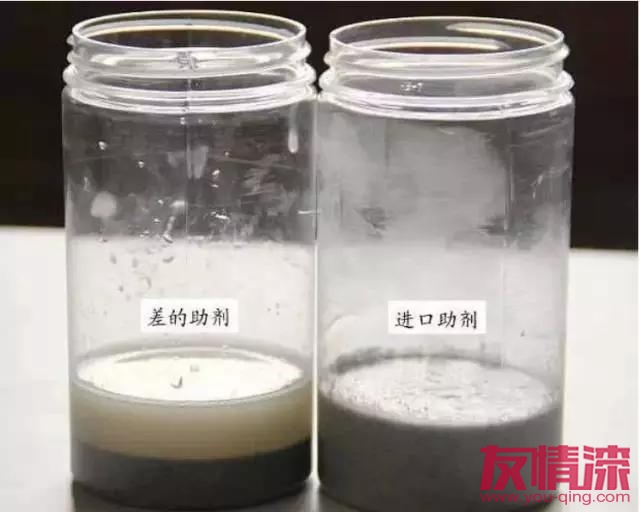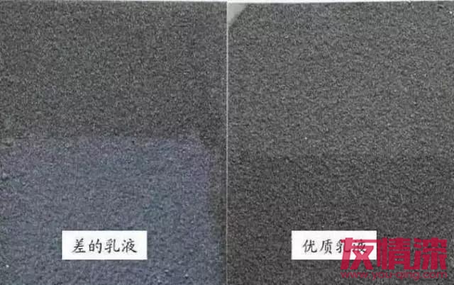 優(yōu)質(zhì)彩砂,在生產(chǎn)高速攪拌過程中,由于硬度高,耐摩擦,不易粉化,最終做出的涂層效果,彩砂顆粒非常清晰,富有質(zhì)感和光澤。(如上圖所示)如果涂層顏色鮮艷,3元/公斤以下的真石漆,只能添加色漿,因?yàn)轷r艷色的高溫煅燒砂,一公斤售價(jià)就在2.5-3.5元不等。(上圖為添加了色漿的真石漆)乳液作為真石漆的成膜物質(zhì),其質(zhì)量的高低直接決定涂層的性能。比如(耐黃變性、防水性、使用壽命等)上圖為,差的乳液與優(yōu)質(zhì)乳液在實(shí)驗(yàn)室進(jìn)行耐紫外線測試的結(jié)果。差的乳液,耐紫外線非常差,太陽照射不久之后,會(huì)出現(xiàn)黃變。上圖為差的真石漆,完工兩個(gè)月后出現(xiàn)黃變現(xiàn)象。耐水性為衡量乳液最重要的指標(biāo)之一。差的乳液耐水性非常差,遇水就會(huì)出現(xiàn)發(fā)白的現(xiàn)象。上圖為采用差的乳液與優(yōu)質(zhì)乳液的真石漆耐水性測試對比。如上圖所示,采用了差的乳液做出的真石漆,天一下雨,水就會(huì)滲透到涂層中,出現(xiàn)泛白現(xiàn)象。水經(jīng)常滲透到涂層,會(huì)大大降低涂層的使用壽命。差的真石漆,廠家為了壓縮成本,乳液的含量一般都比較低,噴涂過程中飛濺,嚴(yán)重浪費(fèi),導(dǎo)致涂布量大增。一般真石漆的正常用量一平米3-4公斤,低價(jià)低檔真石漆,由于浪費(fèi)嚴(yán)重,損耗大,涂布量每平米往往要超出4公斤,有的甚至達(dá)到5公斤。真石漆的助劑用量雖少,但卻決定著整個(gè)配方體系穩(wěn)定性。質(zhì)量差的助劑,產(chǎn)品放置一定時(shí)間后,就會(huì)出現(xiàn)嚴(yán)重的分層現(xiàn)象。(如上圖所示)首先,我們會(huì)想到當(dāng)?shù)氐男∽鞣唬皇聦?shí)上,2014年房地產(chǎn)行業(yè)深度調(diào)整,成本控制力度空前加大,一些大型綜合性涂料企業(yè)為了參與競爭,也開始生產(chǎn)低質(zhì)、低價(jià)的苯丙真石漆。
